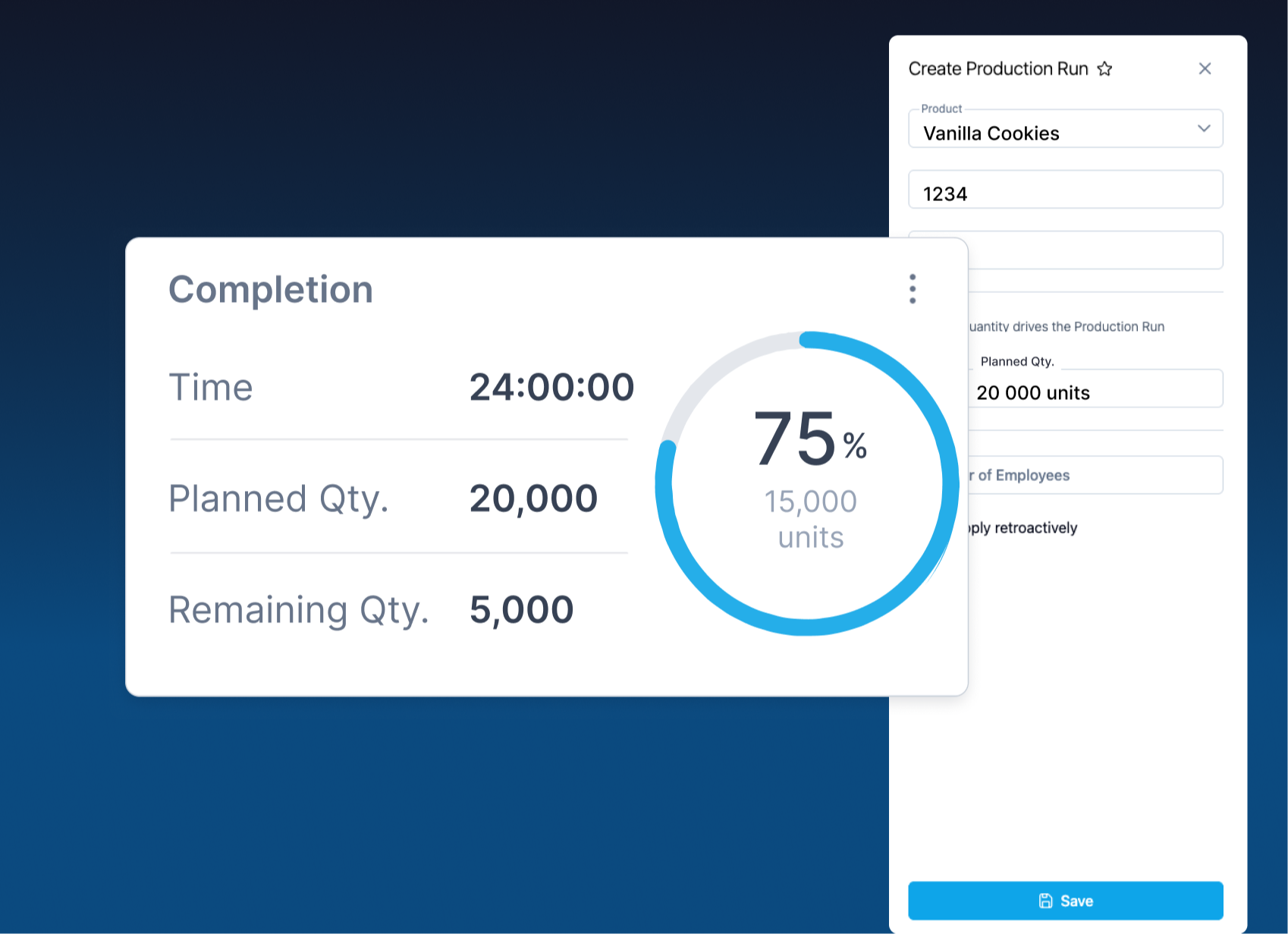 Suivez l’avancement de votre production en temps réel — visualisez en un coup d’œil le pourcentage complété, la quantité produite et le reste à produire.