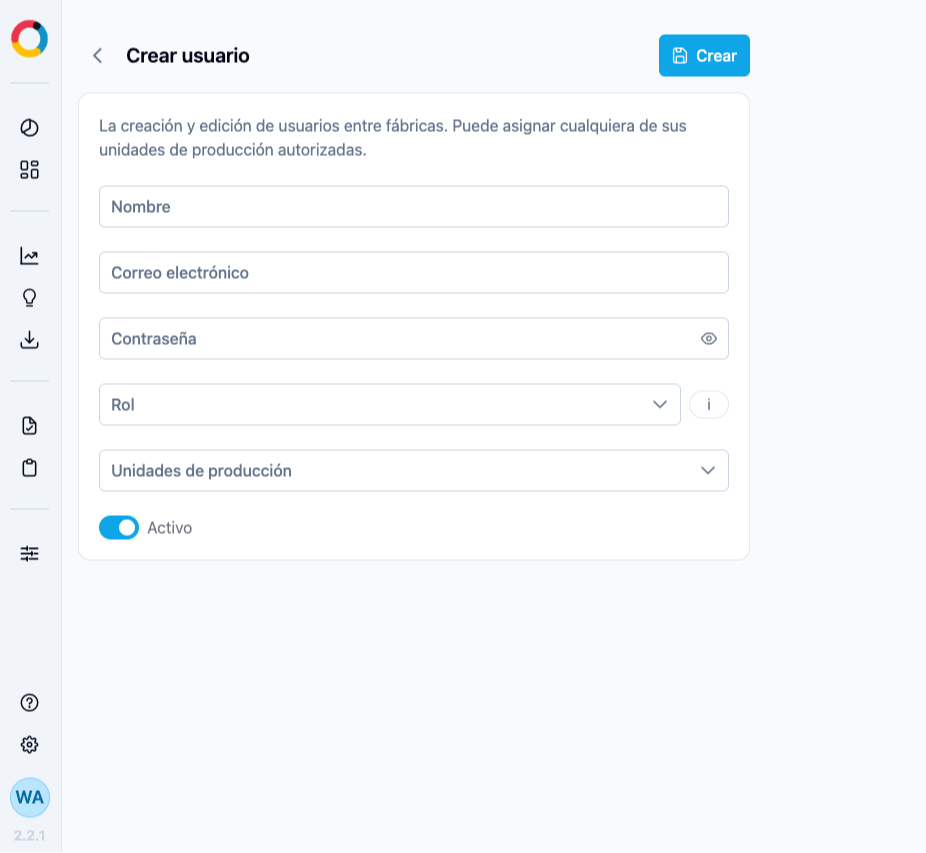 Ingrese la información del usuario. Deberá crear una contraseña temporal para dicho usuario y enviársela. Haga clic en "Crear" (botón azul en la esquina superior) una vez completado.