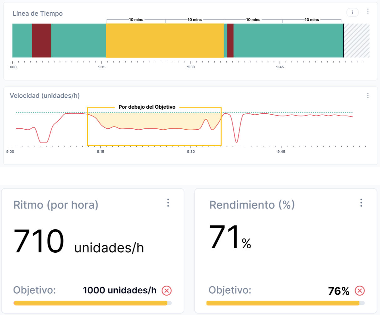 Gráfico de Velocidad → Visualiza cuándo la velocidad de producción cae por debajo de los objetivos, incluso durante el tiempo operativo.