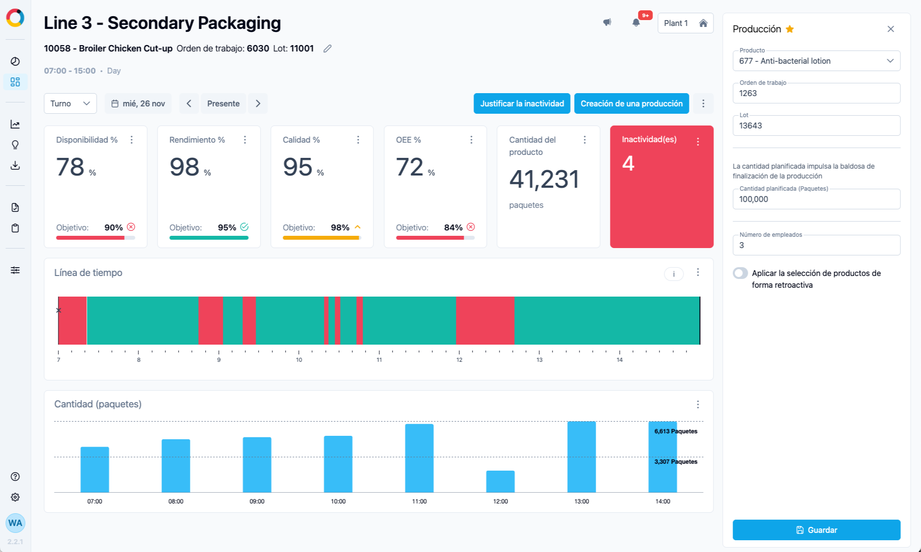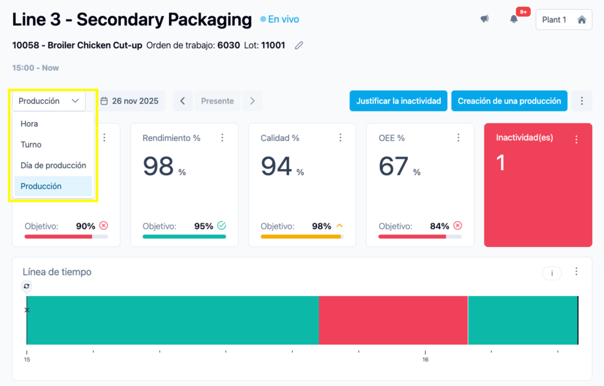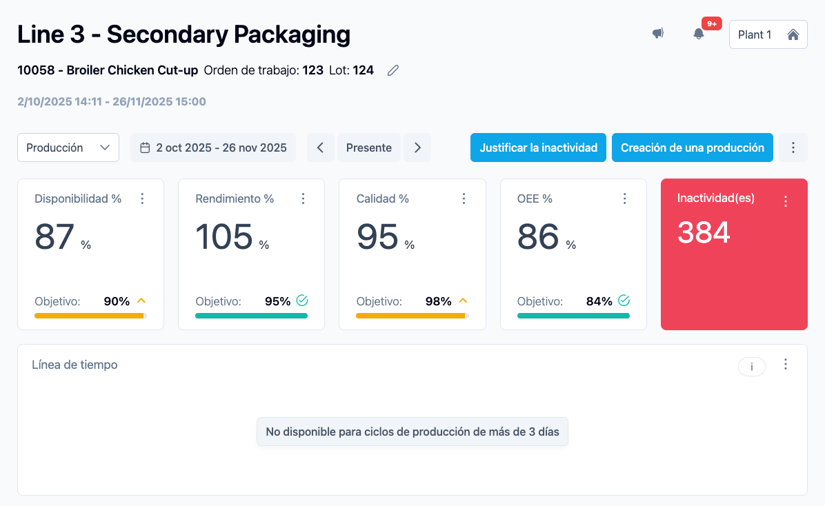 Ten en cuenta que la pataforma en tiempo real actualmente restringe la visualización de datos en la línea de tiempo a Corridas de Producción con una duración máxima de 3 días. Para optimizar tu experiencia de navegación, se recomienda ingresar Órdenes de Trabajo (OT) o números de Lote (LOT) distintos, incluso cuando el SKU o producto fabricado sea el mismo. Cada entrada de un nuevo OT o LOTE, incluso para el mismo producto o SKU, genera la creación de una nueva Corrida de Producción.