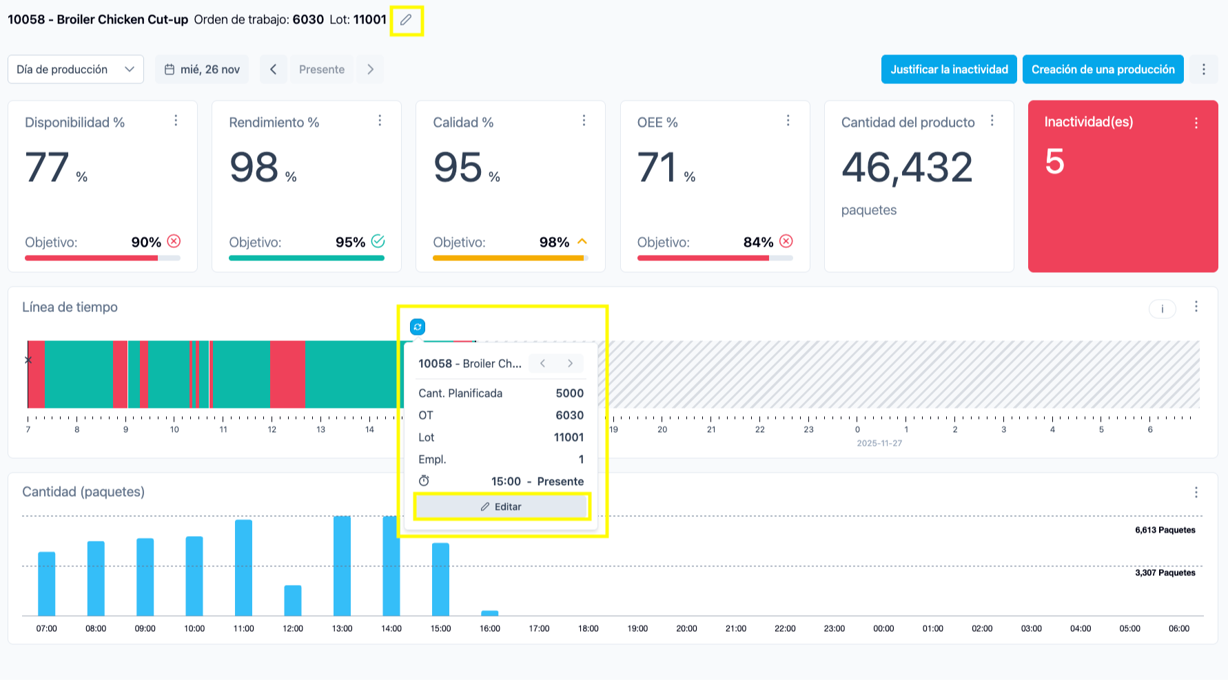 Para editar una Producción, haz clic en el marcador (triángulo con flechas) en la línea de tiempo o en ícono de lapiz junto al nombre del producto que está corriendo, del Panel de la Unidad de Producción y selecciona ‘Editar’. Se abrirá la ventana “Modificar Producción”, donde los usuarios podrán realizar cambios, incluyendo ajustar retroactivamente la hora de inicio.