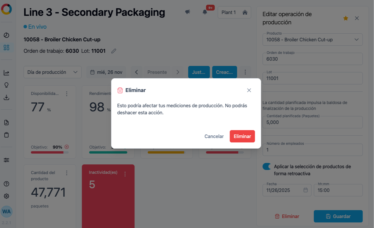 Aparecerá un mensaje de confirmación para eliminar la corrida de producción seleccionada.