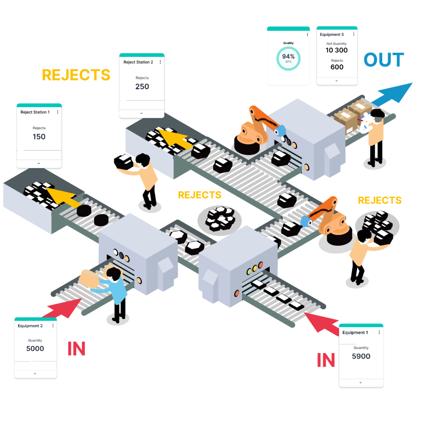 Rejects are calculated by subtracting the net output (OUT) from the total produced at the entry of the line (IN).