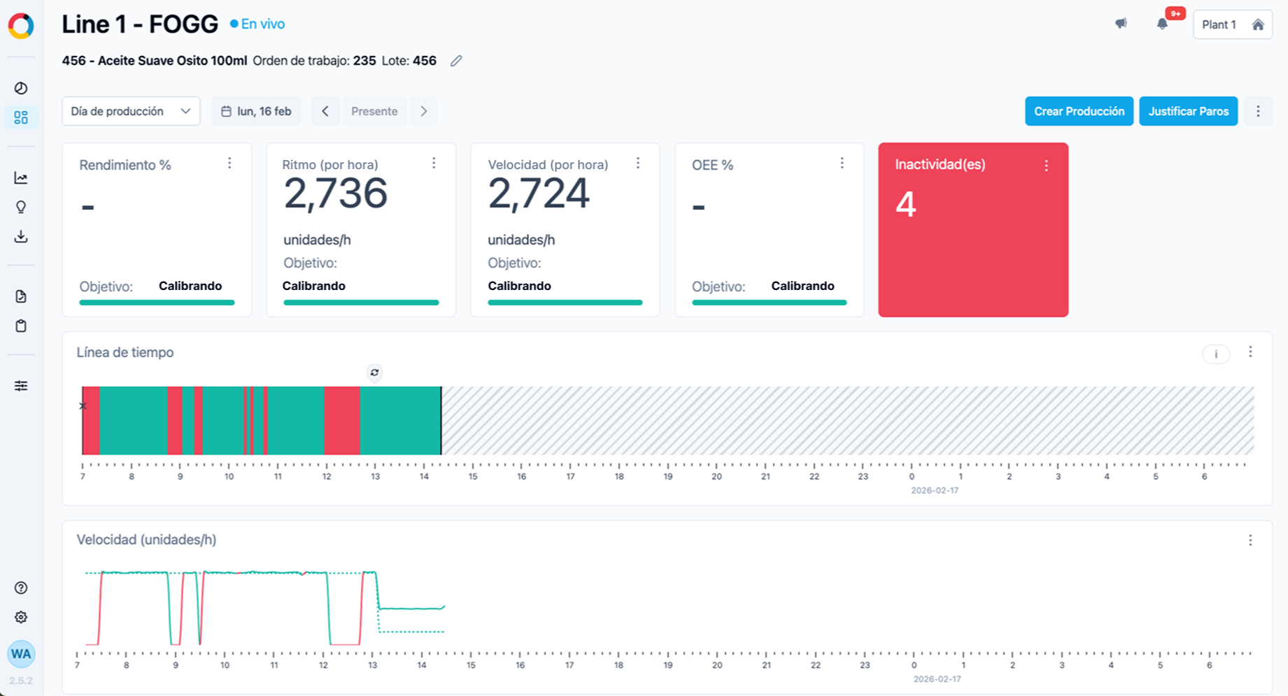 Dado que el objetivo del Ritmo impacta las métricas de Rendimiento y OEE, Tile+ mostrará temporalmente un guion (-) y el mensaje “Calibrando” mientras ajusta los datos. No te preocupes: tus métricas precisas aparecerán una vez que finalice la calibración (puede tardar aproximadamente 60 minutos), sin pérdida de datos.